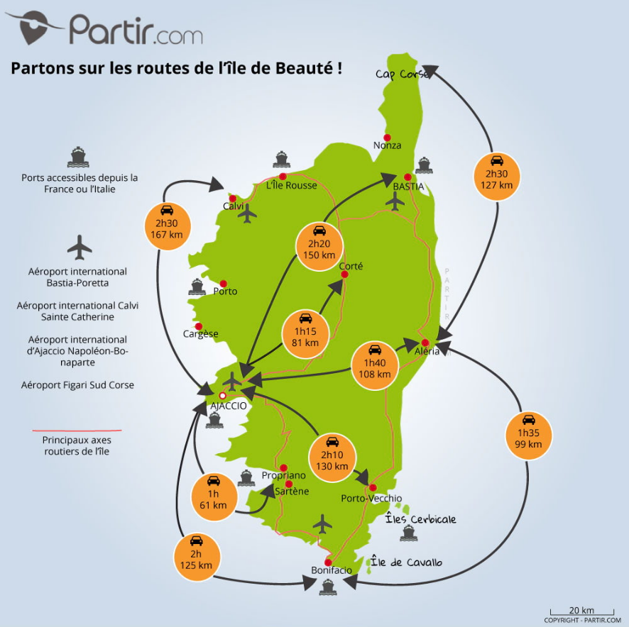 Qu’on décide de visiter Ajaccio ou Porto-Vecchio en premier, le tout est de bien gérer son temps et pour vous aider, Google Maps sera votre meilleur allié ! Voici déjà la carte de partir.com pour avoir un aperçu d’ensemble 🙂