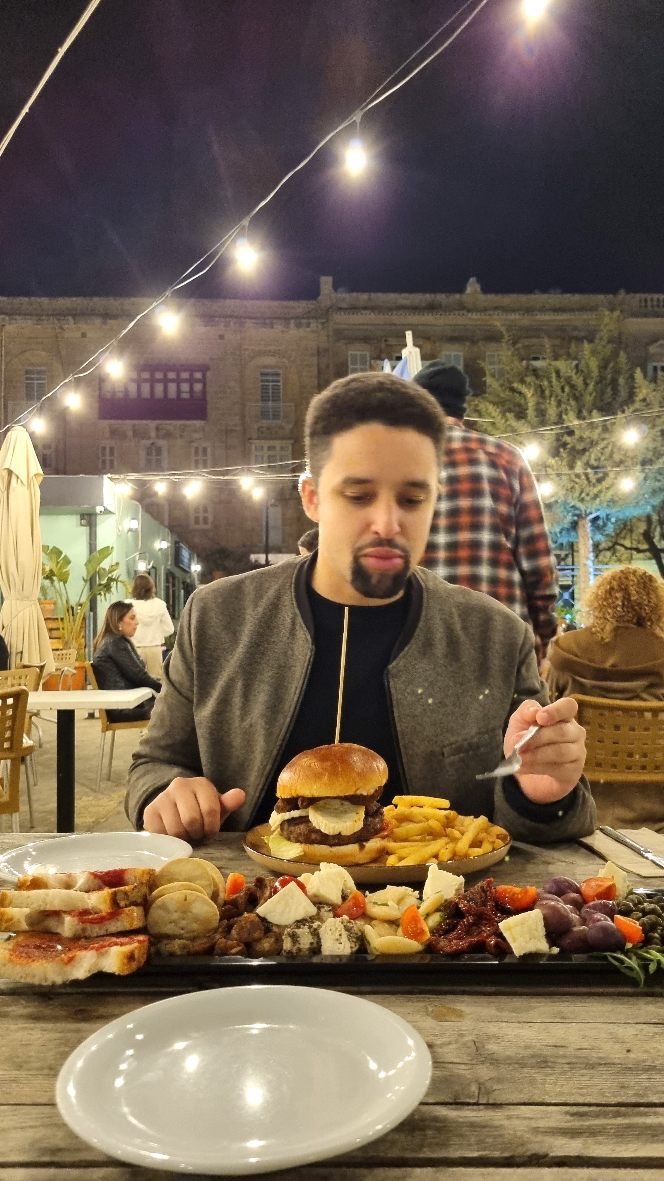 Dès notre arrivée à l’hôtel, on a posé nos valises et on est parti se balader dans Floriana. On est tombé par hasard sur Balzunetta. On a décidé de prendre un plateau maltais (et un hamburger pour Sébastien 🥲😁) pour découvrir les incontournables. Au menu, saucisses maltaises, tomates séchées, câpres, Galletti (crackers maltais), pains à la tomate, haricots, olives et le fameux fromage de chèvre (le restaurant fait son propre fromage de chèvre) au goût bien fort et prononcé. Je recommande ! Très cool et local.