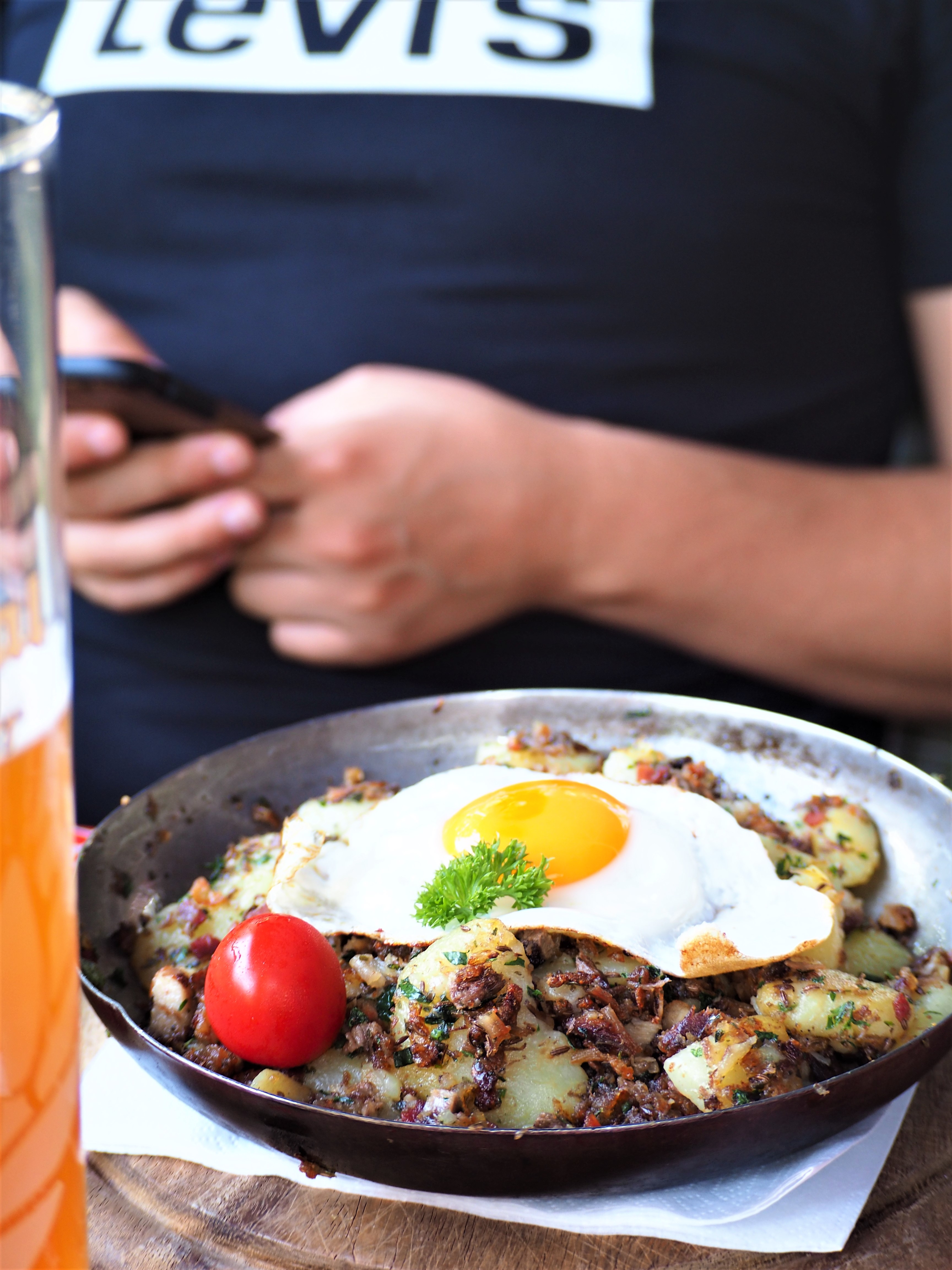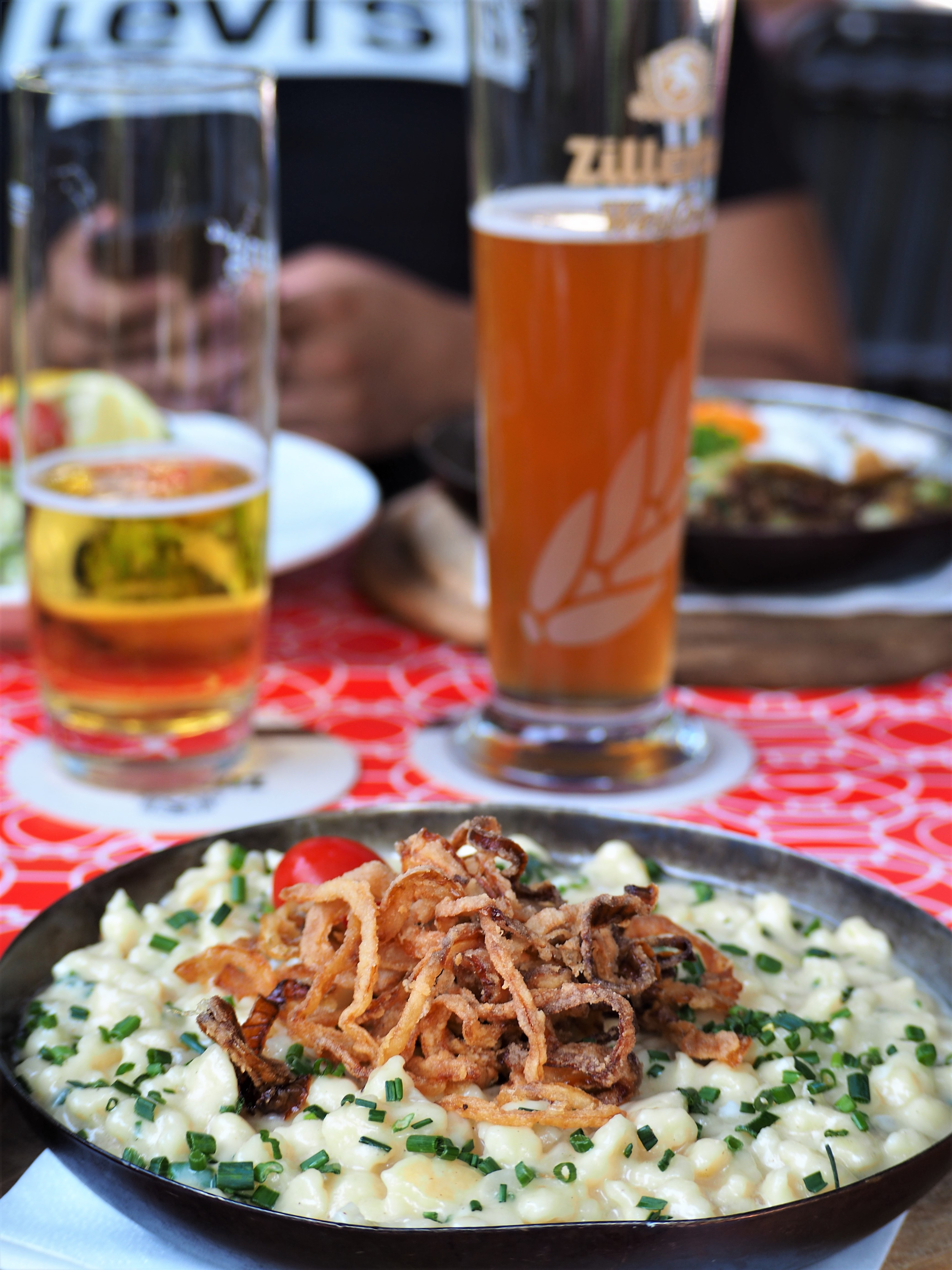 - Le Gasthaus Spitzbua – un peu en retrait de la ville, sans prise de tête, vous mangez très bien ! Pas mal de plats à la carte, mais le käsespätzle (à droite) était fait maison et très bon😊. À gauche, une autre spécialité, le Tiroler Gröstl, qui compose avec des pommes de terre et petits cubes de viande de bœuf ou de porc. Le tout est revenu dans la poêle avec du beurre et des oignons.