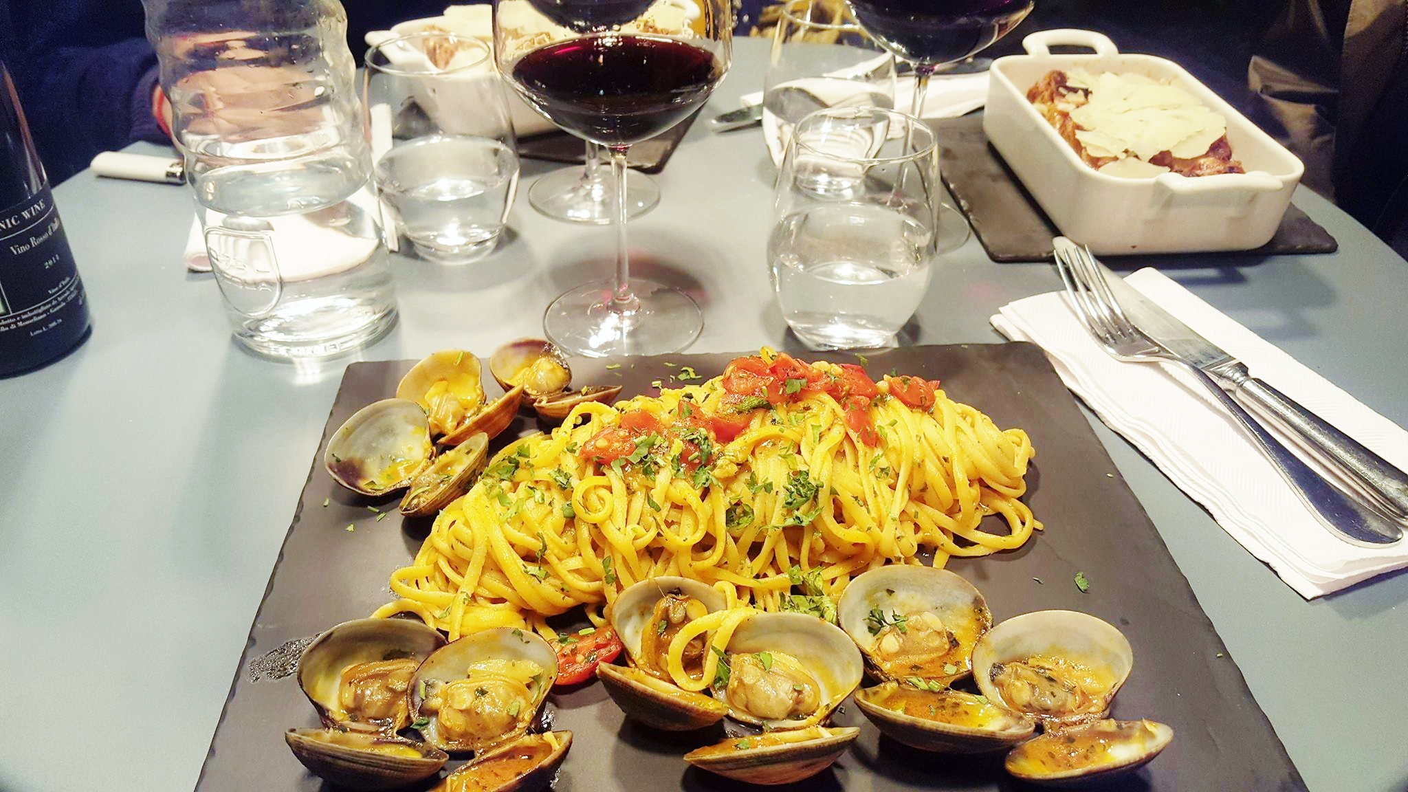 Parmi les rouges, on retrouve le fameux « Valpollicella » de la région de la Vénétie (notes de cassis et de pain d’épice/cannelle), le « Come la panterra e i lupi nella serra » d’Emilia Romagna qui possède des notes de cerises et de tabac, ou encore le « Nebbiolo di Carema Riserva » du Piémont, un vin sucré assez surprenant à la robe orange ! En blanc, 5 vins sont à la carte, dont l’Oro d’isée de Ligure. Je vous laisse les découvrir 😉