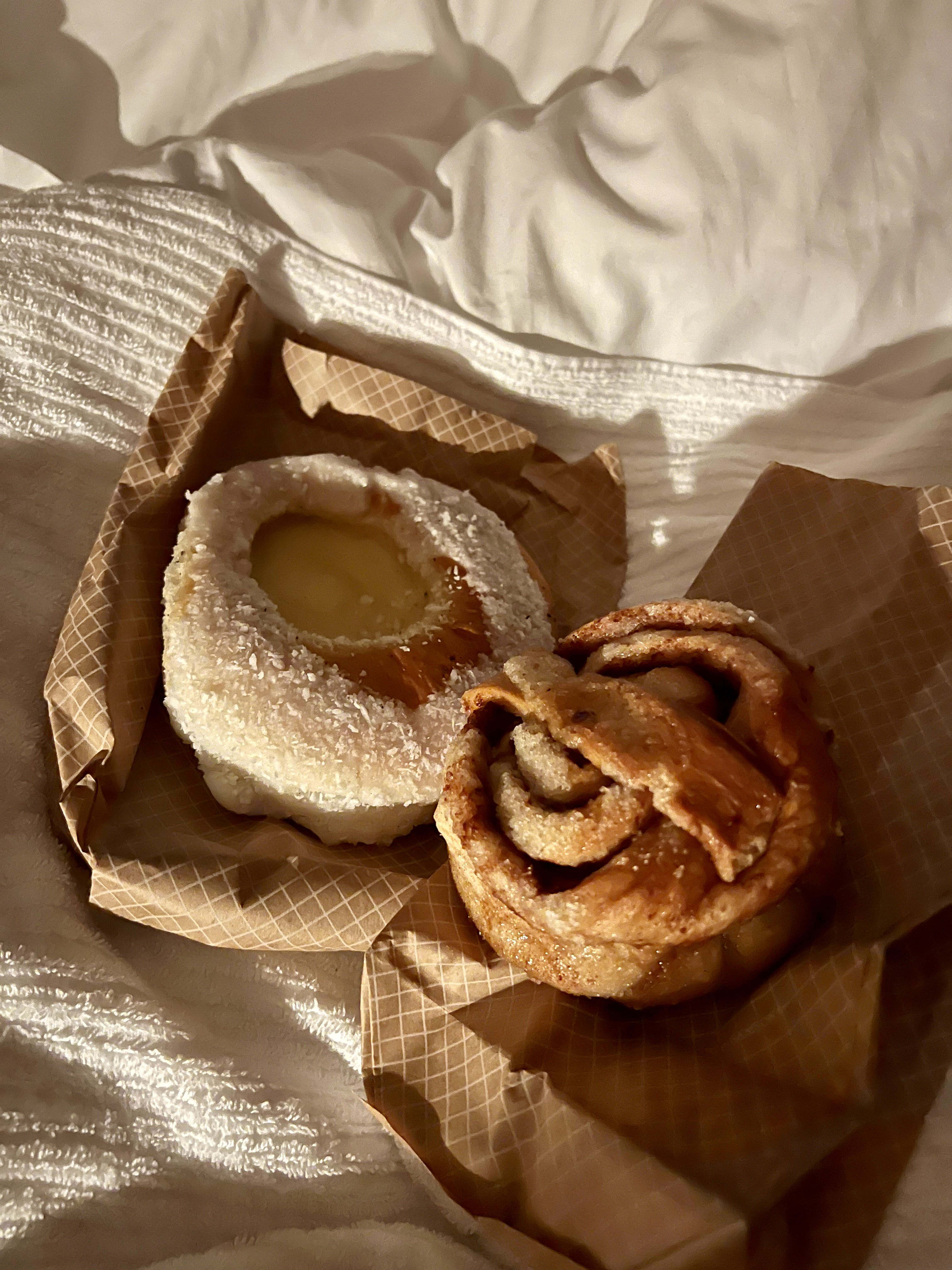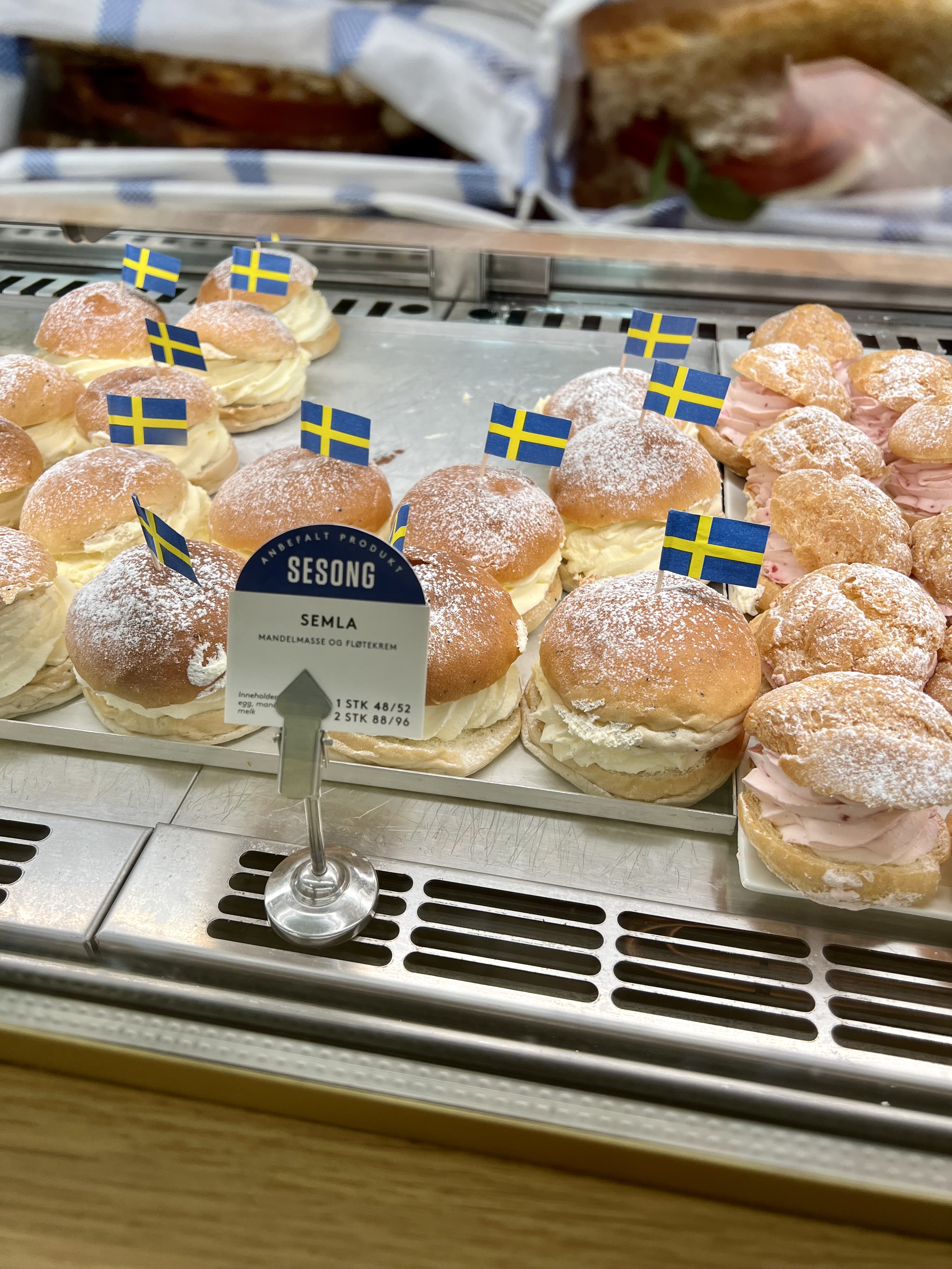 Côté desserts, l’omelette norvégienne ! Le Rømmegrøt (sorte de porridge à la crème), les gaufres garnies au brunost (dont je vous parle plus haut) – fromage marron, sucré à base de lait de chèvre et de vache -. et les fameux kanelboller ou roulés à la canelle. On les a pris chez W.B Samson et c’était très bon !