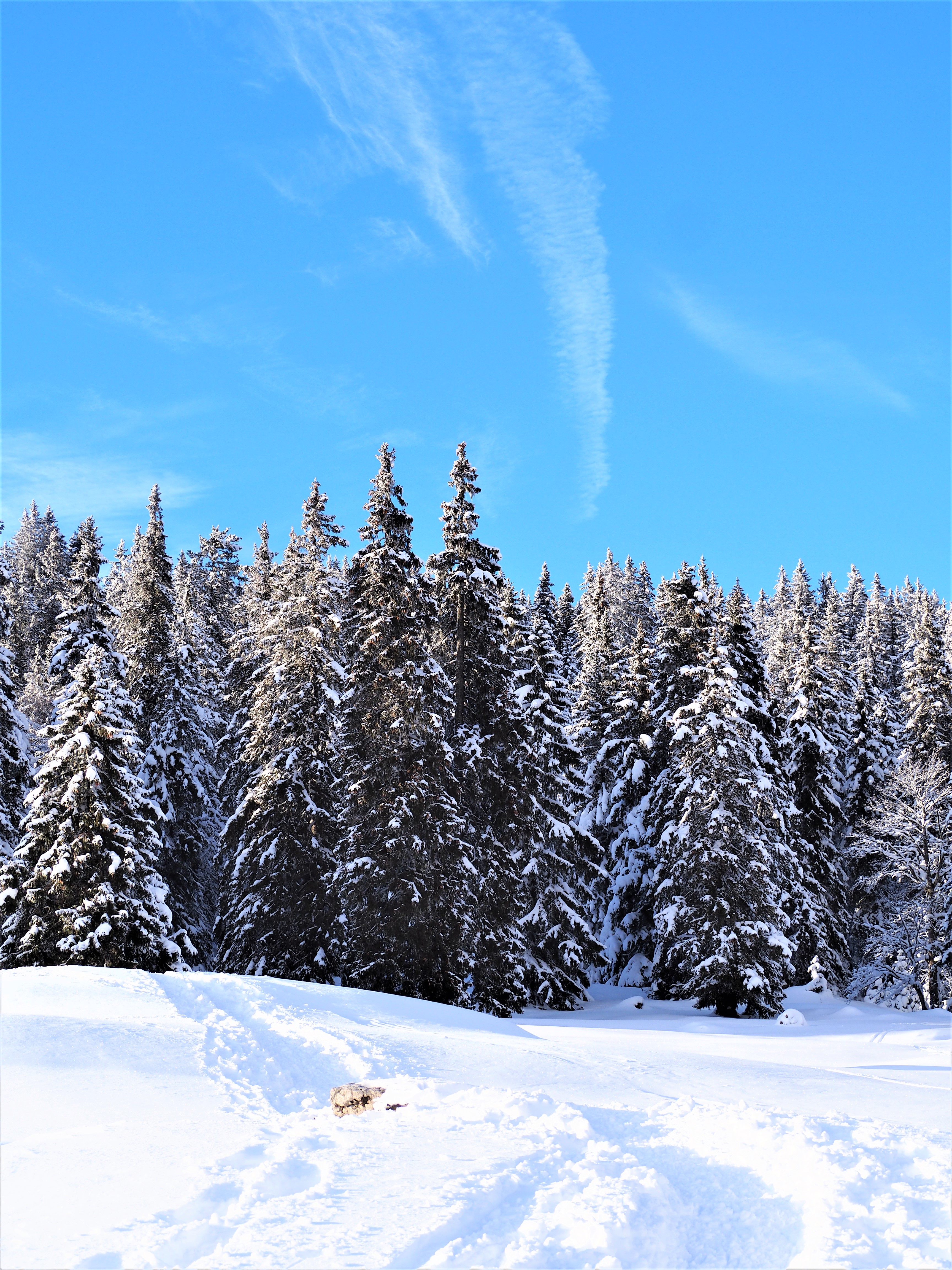 Après avoir passé le village de Montricher, on a emprunté la route du Mont Tendre où on a garé les voitures. Ensuite, on a emprunté le chemin de Trail Vallée de Joux 2019 – 85K. Le chemin de trail est vraiment féerique sous la neige. Un paysage magique se dévoile tout au long de la balade. Les majestueux sapins enneigés et les paysages nous laisse, en fait, sans voix ! Il y règne par d’ailleurs un silence de mort et je dois dire que c’est vraiment impressionnant une fois qu’on s’arrête pour écouter.