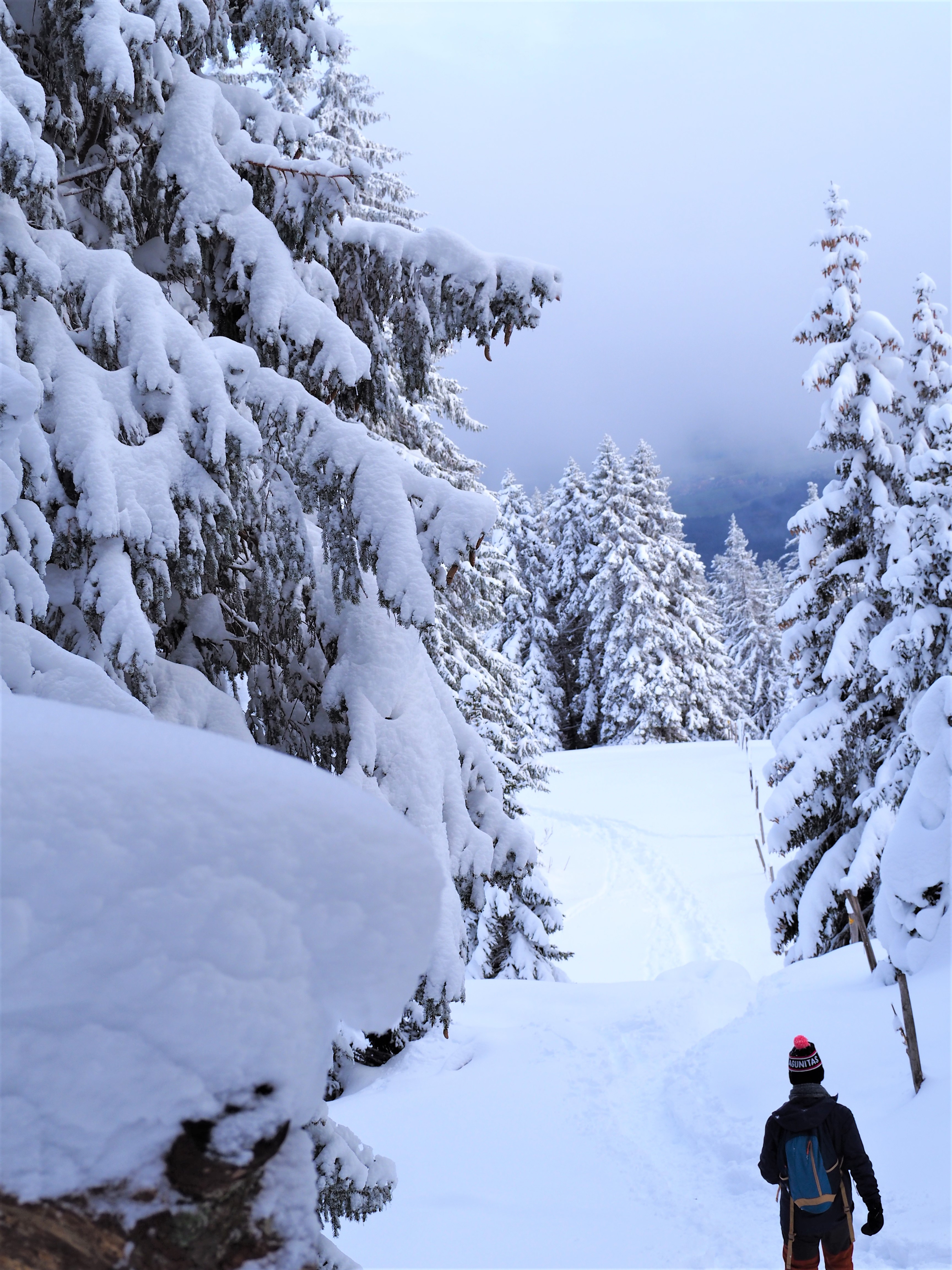 On est monté en groupe, certains équipés en skis, d’autres avec des raquettes. N’étant pas équipé de raquettes, on les a louées chez Sport Discount à Lausanne, un super rapport qualité/prix.