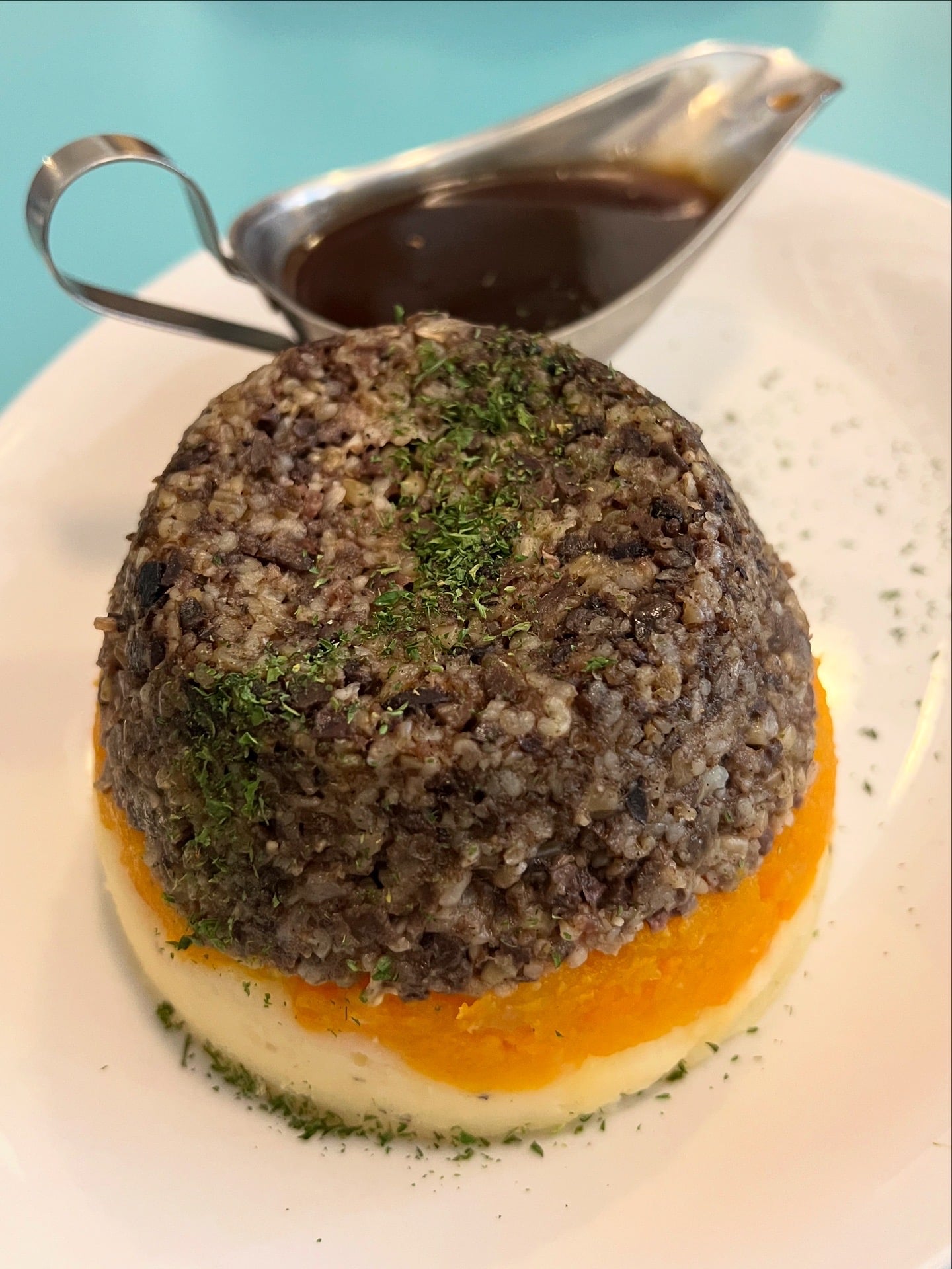 Traditionnellement le haggis a l’apparence d’une panse de brebis farcie d’un hachis à la viande (abats de mouton et avoine). Je l’avais trouvé plutôt dans la campagne écossaise, dans les Highlands lors d’un premier voyage.