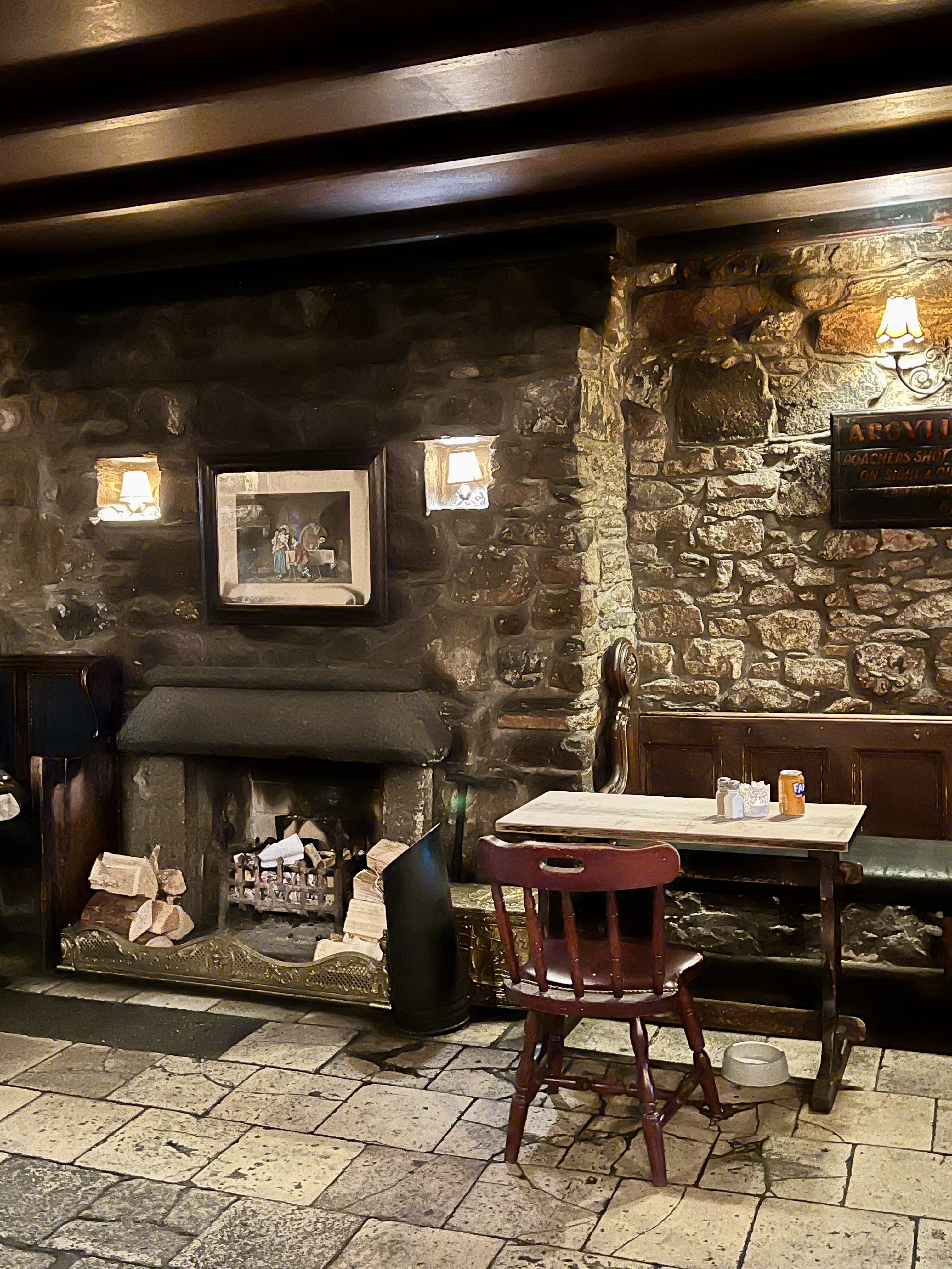 Pour boire un verre, je vous conseille le bar The George Hotel à Inveraray. C’est le bar le plus ancien de la ville. C’est une personne française de l’hôtel, installée depuis des années en Ecosse) qui nous l’a conseillé (pour boire un verre, pas pour y manger). Son architecture est splendide, tout de bois vêtu avec ses bas plafonds et sa chemisée à foyer ouvert. Merci encore pour ce bon conseil 🙂
