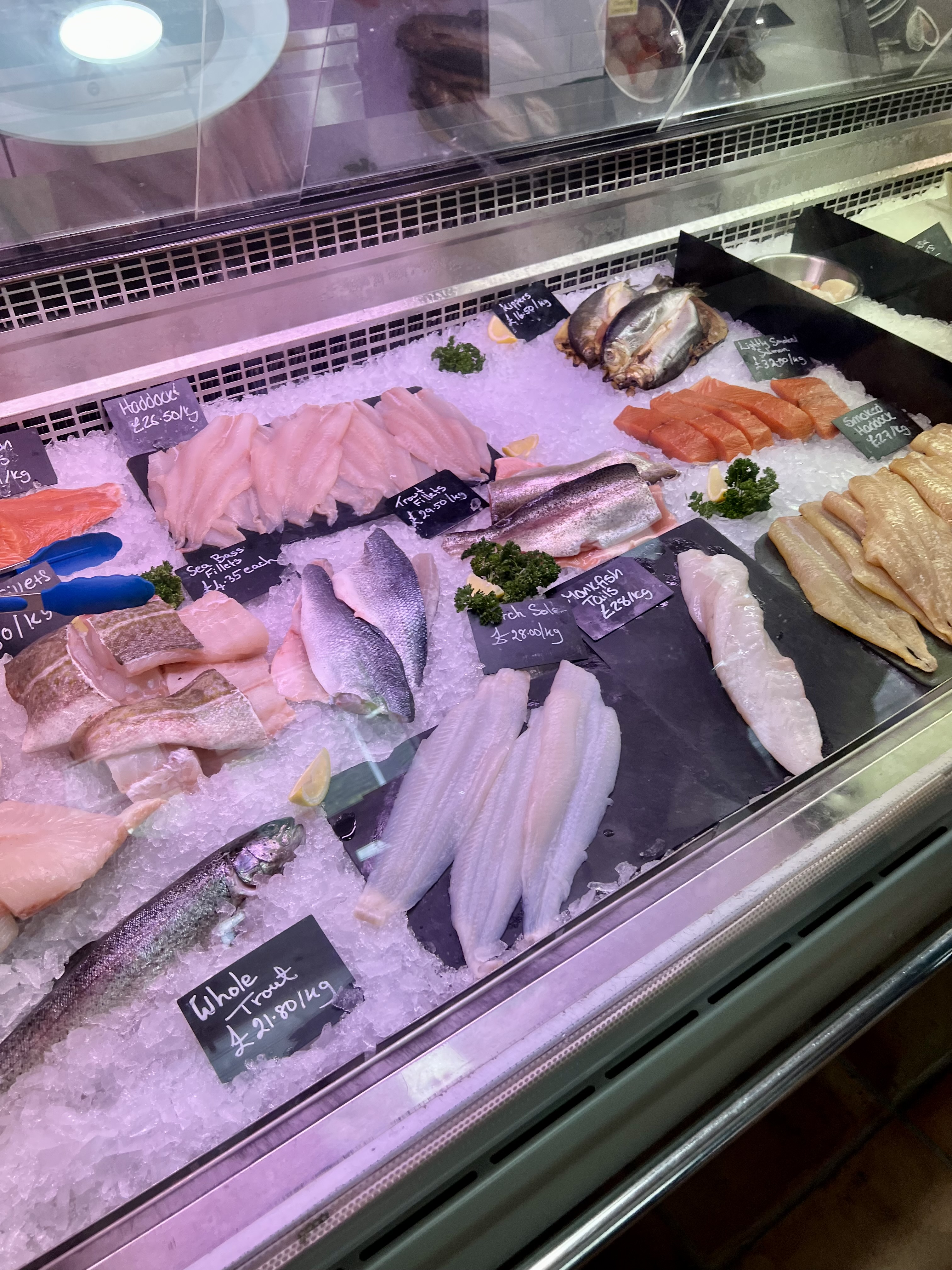 De nombreux produits de la mer comme huîtres, moules, crustacés, saumon fumé écossais sont à déguster sur place et même à acheter.