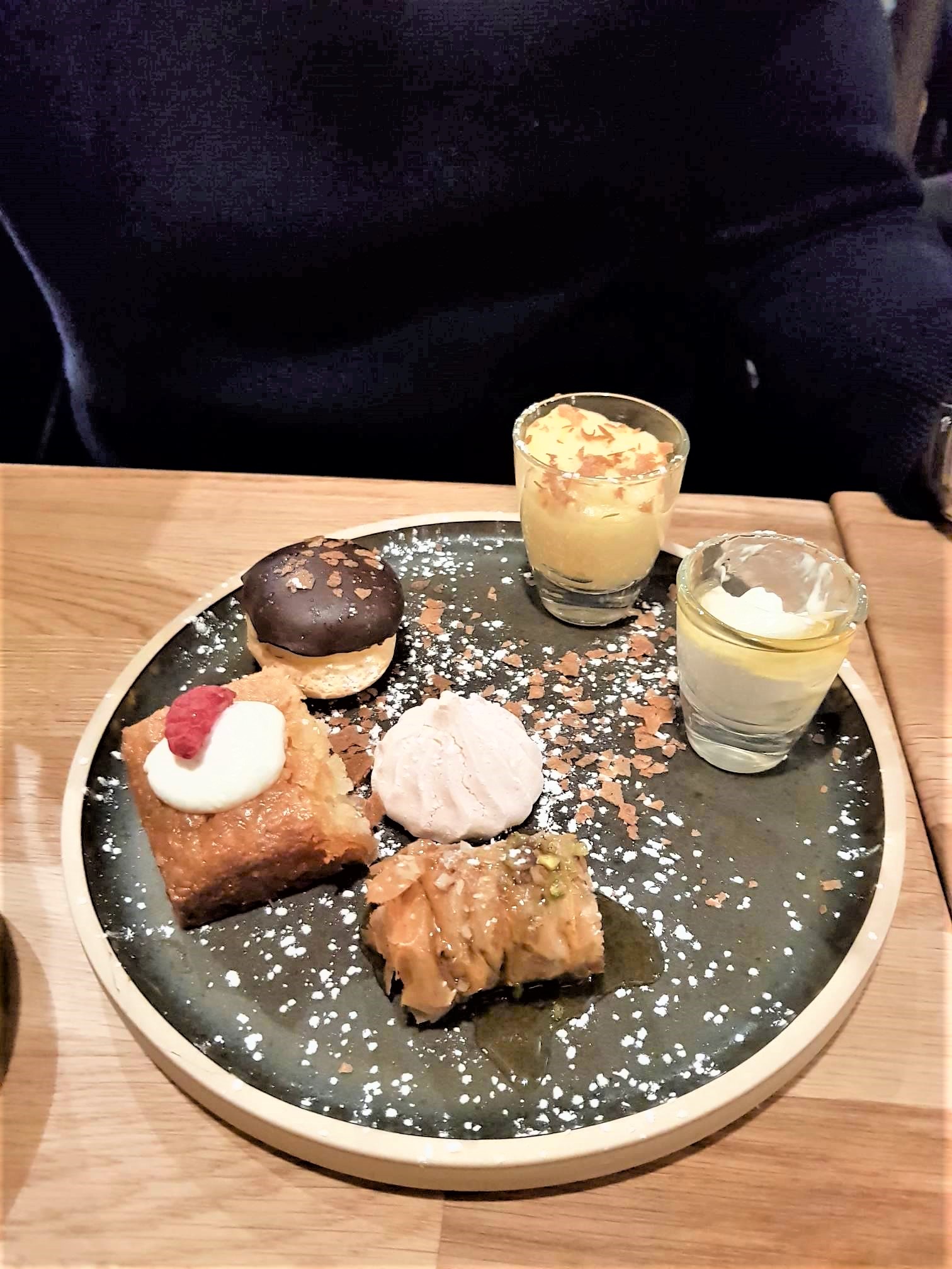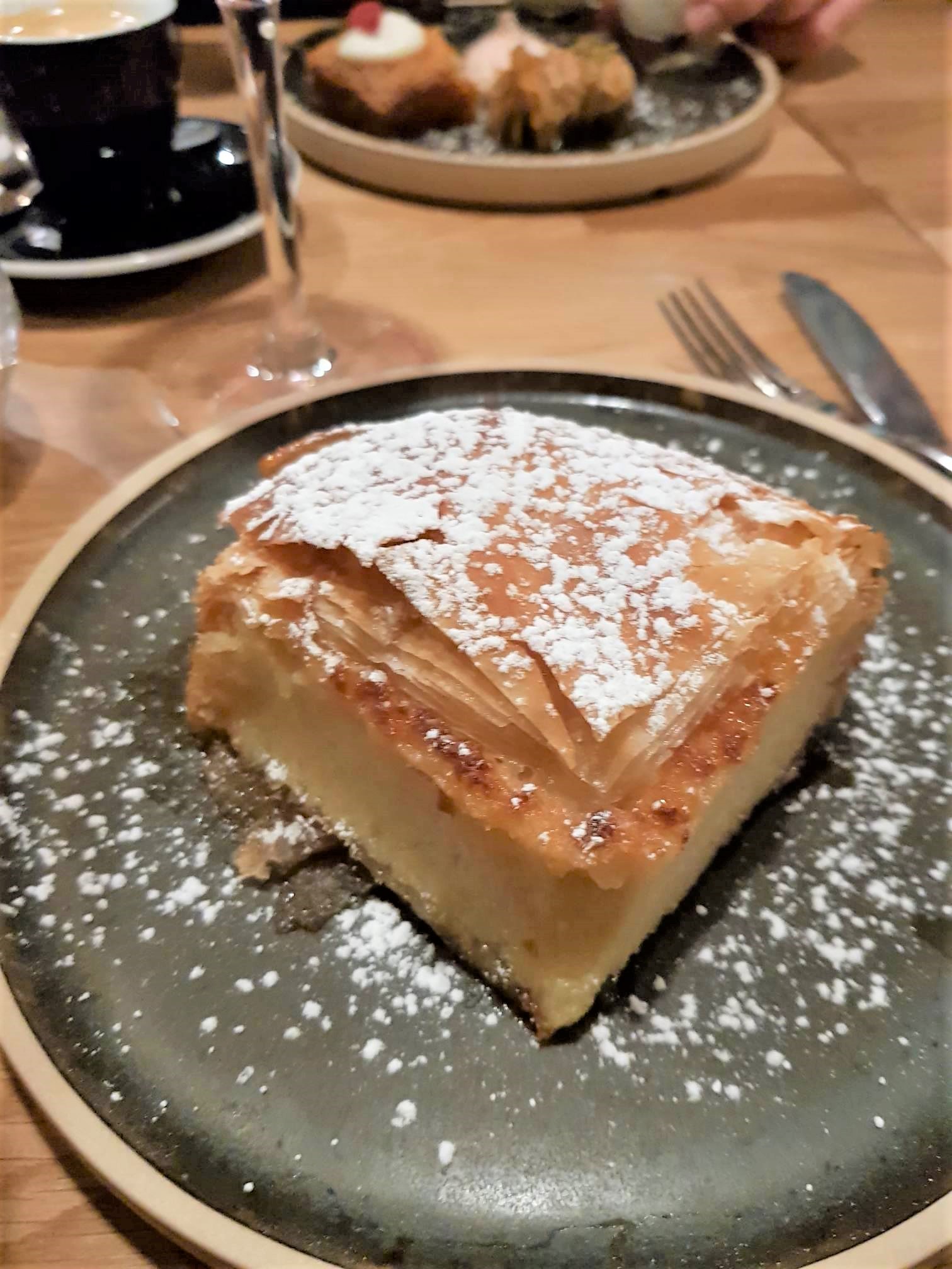 En dessert, on a opté pour le café gourmand avec assortiment de pâtisseries grecques dont le fameux baklava. Et le Galatopita : un feuilleté au lait à la semoule et cannelle. C’était très bon et original, quoique un peu trop sucré à mon goût !