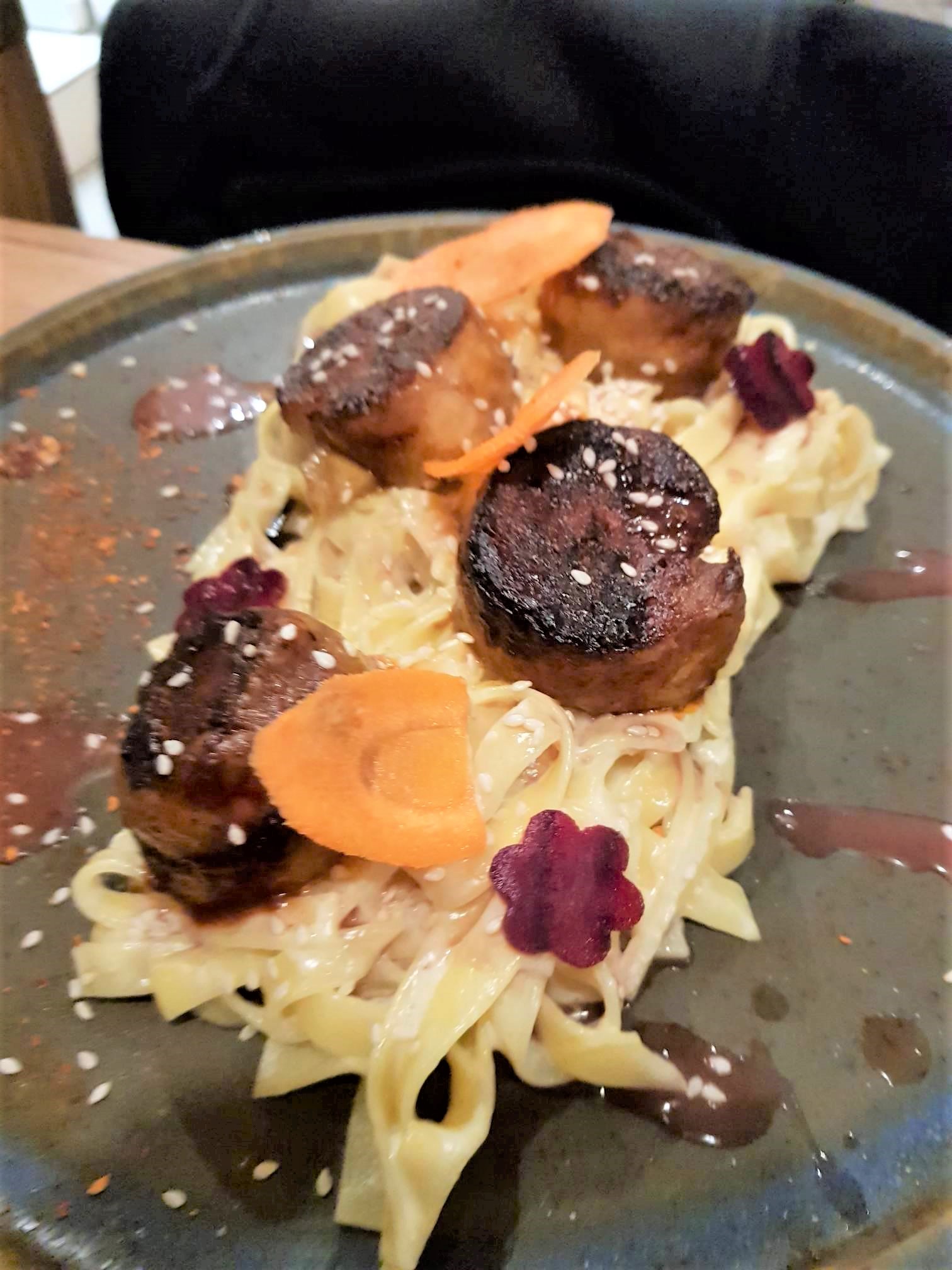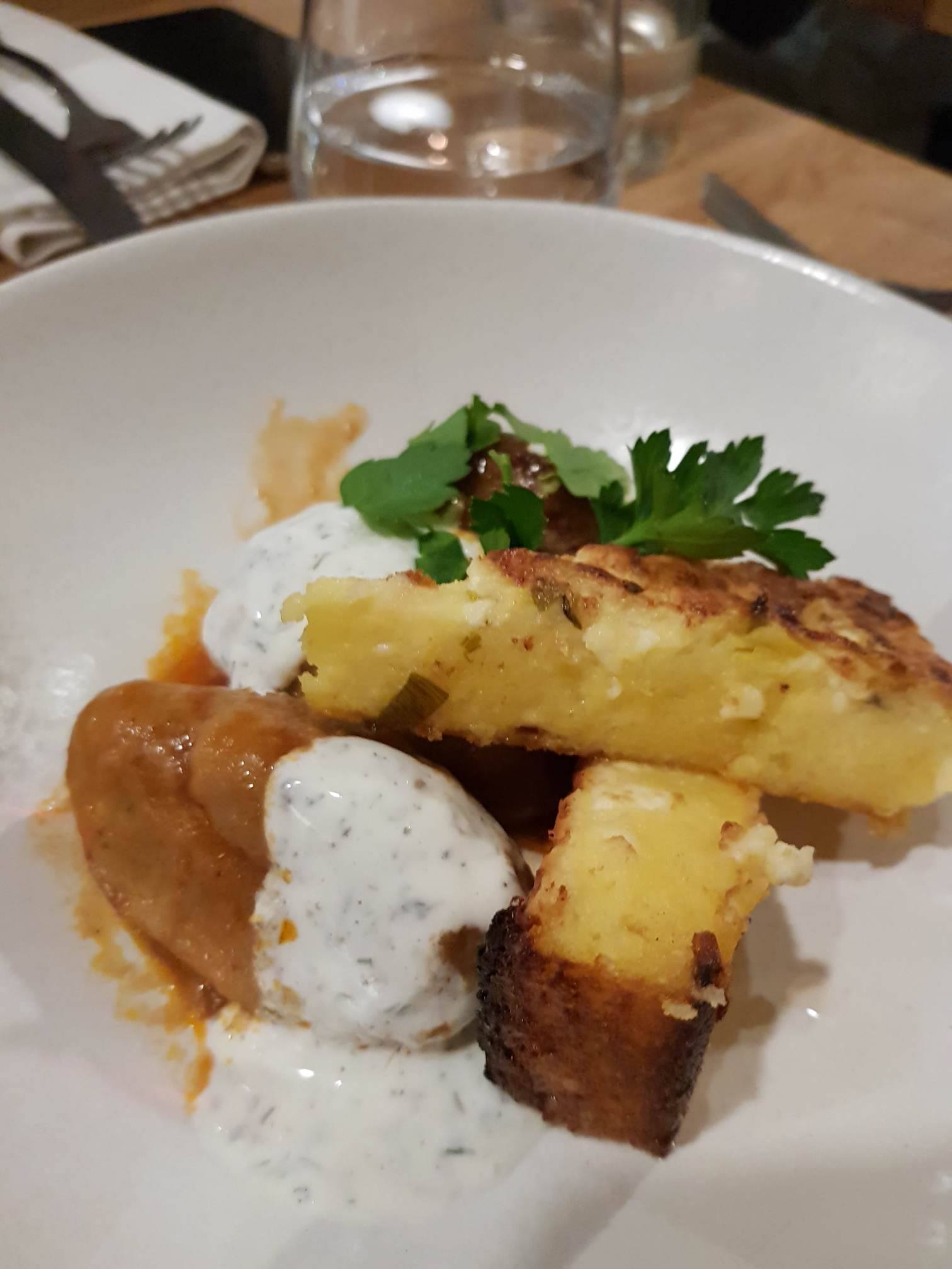Ensuite, j’ai choisi les délicieuses et tendres boulettes de veau cuites au four accompagnées de polenta à la fêta pour 18 €. A droite les saucisses de porc.
