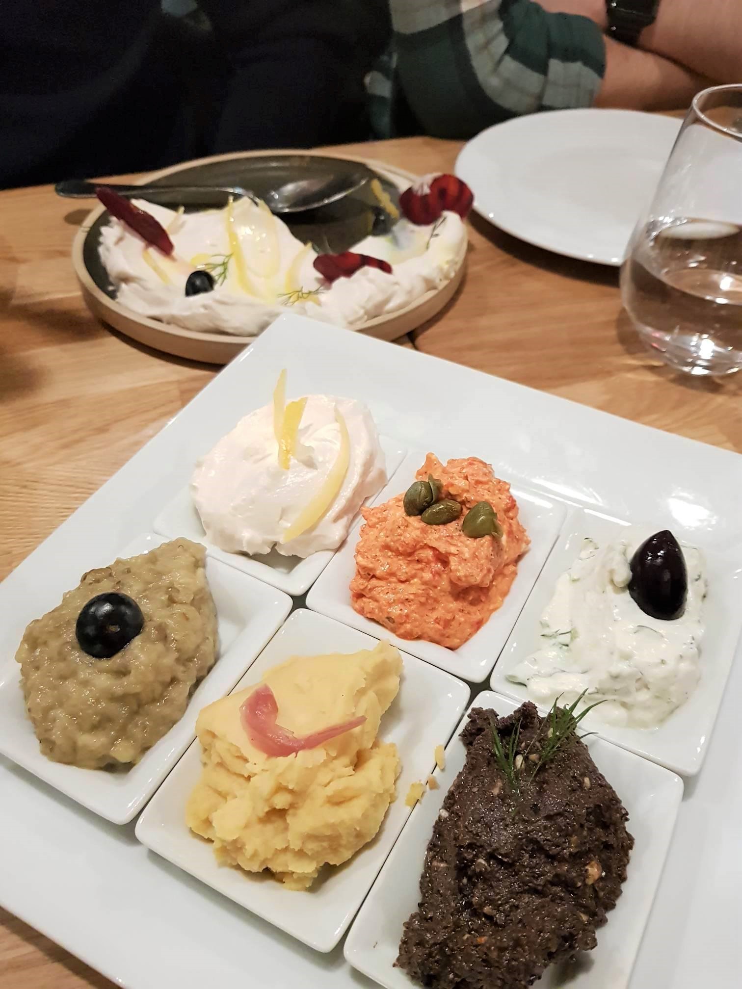 En entrée on a pris le pikalia, des assortiment d’entrées froides à partager – tarama blanc, Ktipiti, Tzatziki, Fava, Mélitzanosalata, Purée d’olive pour 17, 5 €. Servies avec un grand panier de pain pita, c’était un régal. D’ailleurs, si vous découvrez la cuisine grecque, c’est sans doute une excellente entrée en matière !