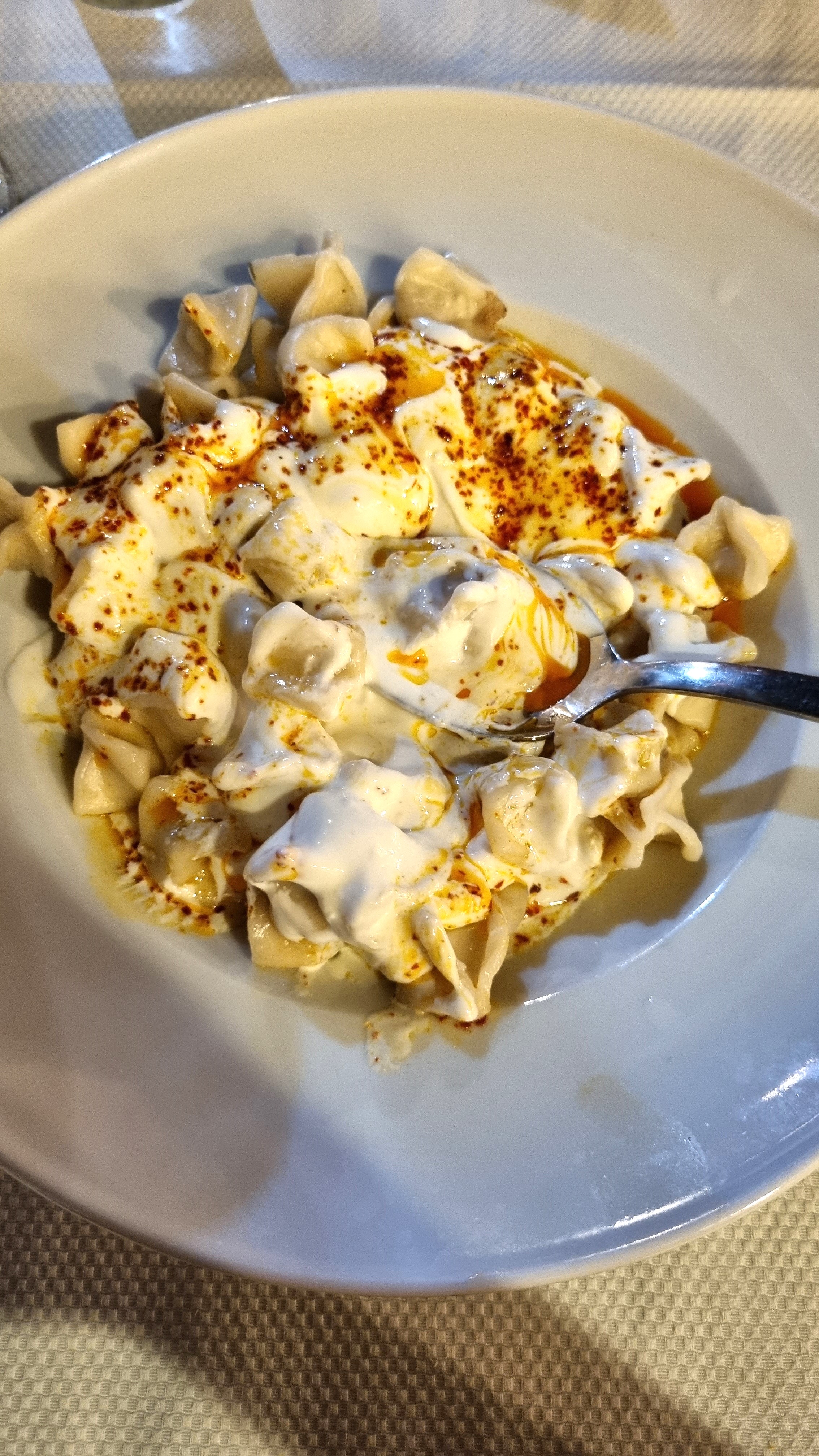 On s’est régalé ! Je vous conseille d’y aller tôt si vous pouvez car certains plats étaient déjà rayés de la carte. Tout était parfait. j’ai opté pour les fameuses manti, de petits ravioli farcis à la viande et servis avec du yaourt et du beurre fondu infusé au piment. Le dessert, était un délice aussi !