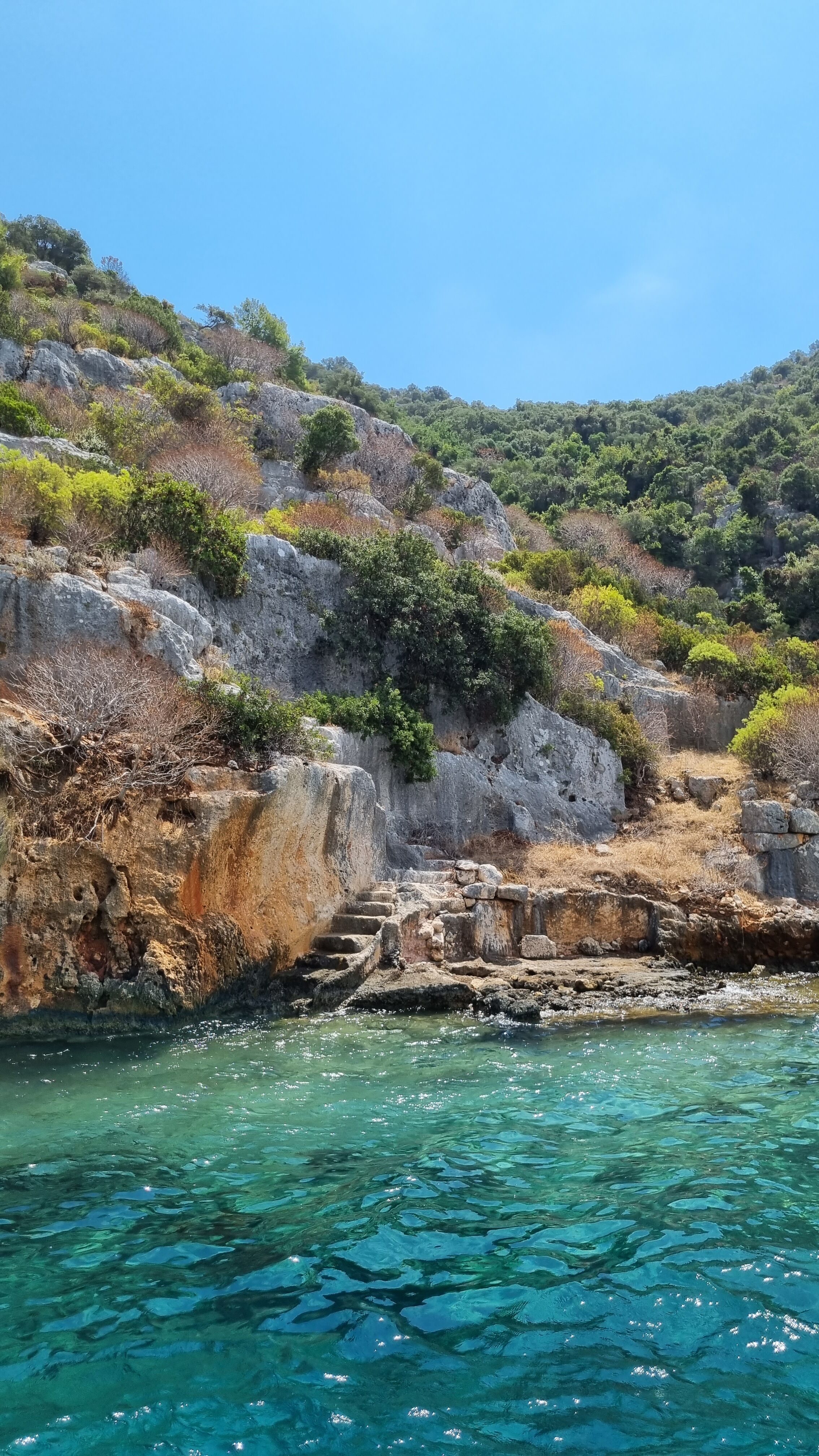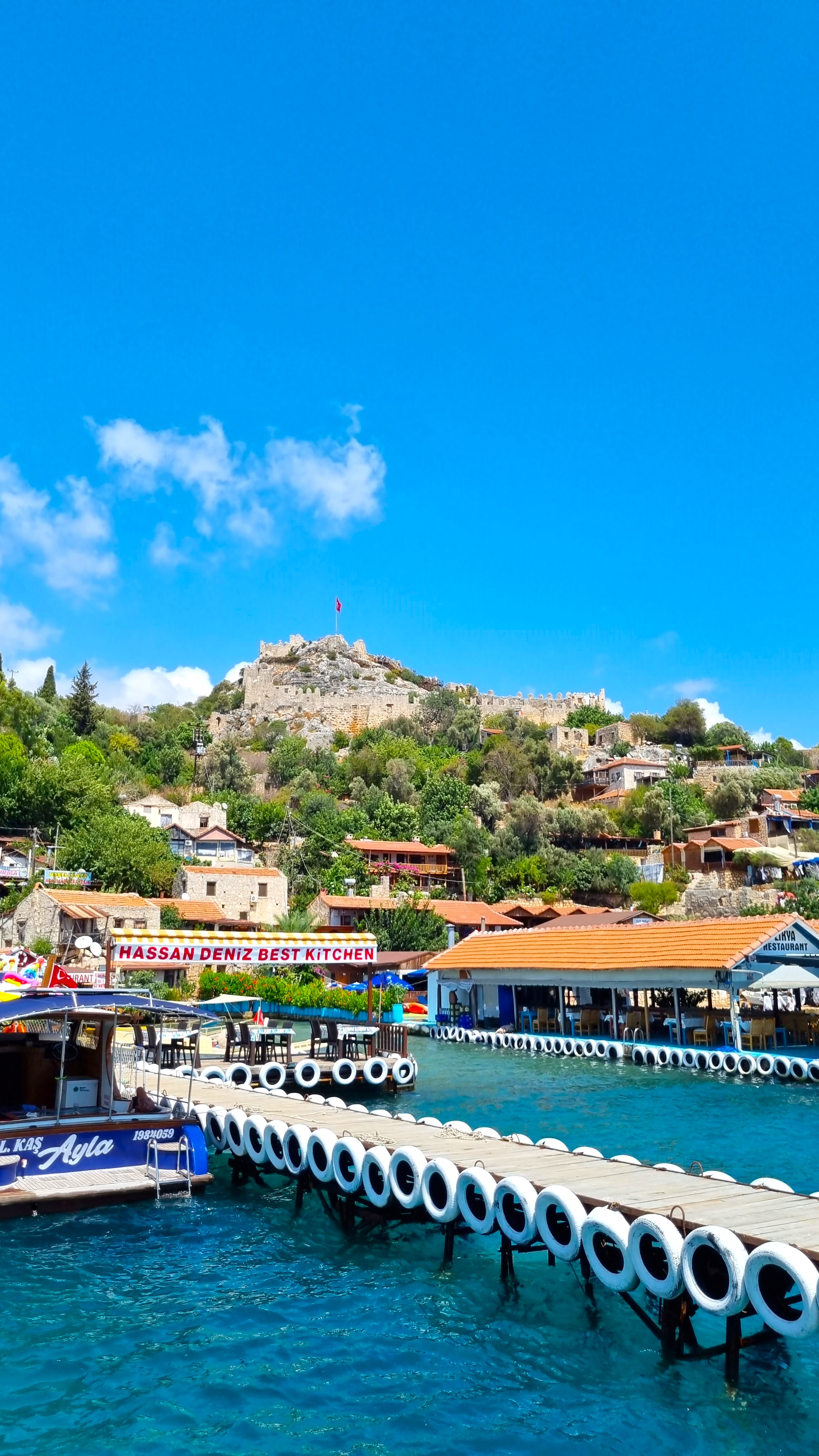 On stoppe également une heure à Simena, anciennement nommé Kaleköy. C’est un village surmonté des ruines d’un château. Il est situé sur une presqu’île, accessible seulement par la mer ou à pied.