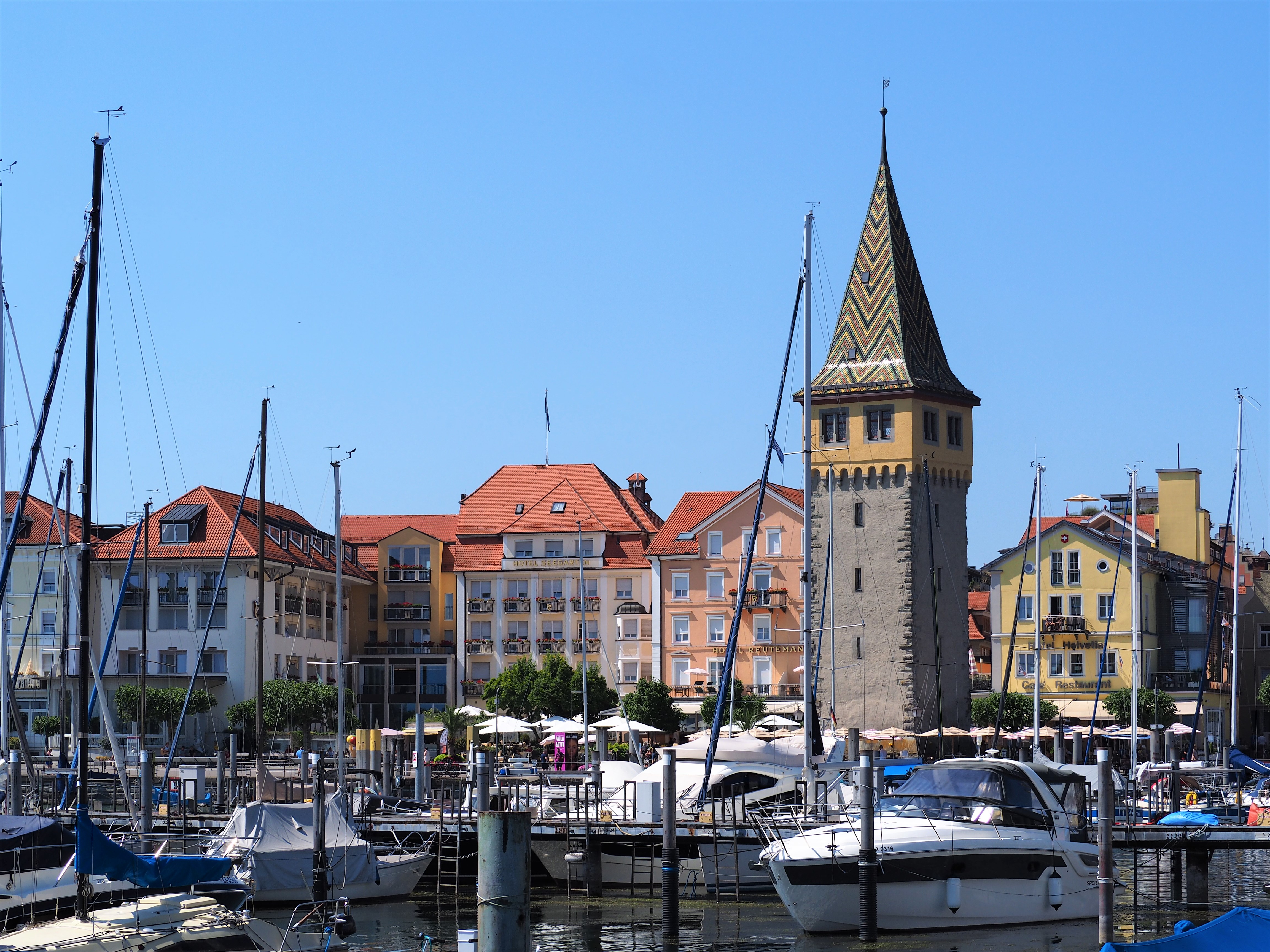 Chez Swiss Restaurant. En plus d’avoir la vue sur le port, vous pourrez admirer aussi la Mangturm Tower, l’un des incontournables de Lindau.